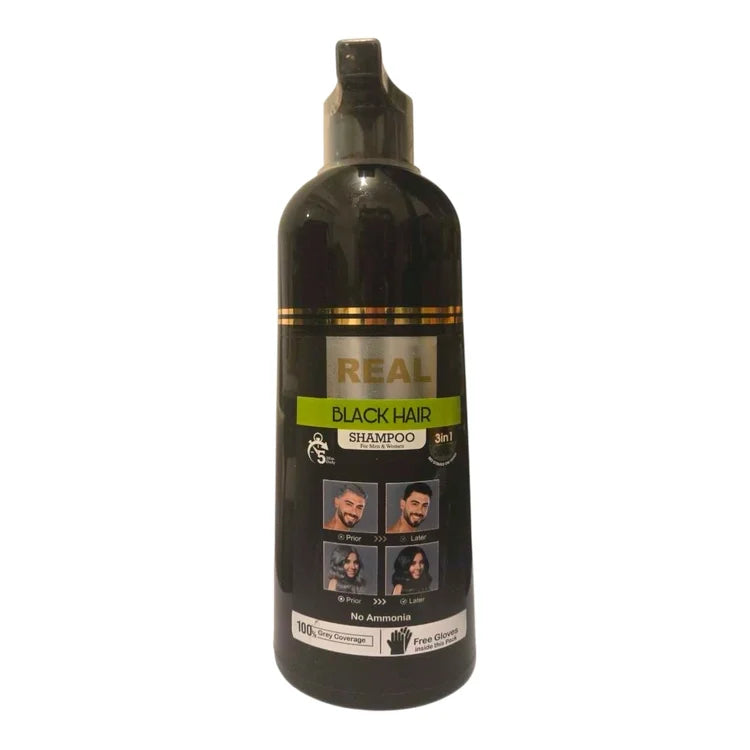 Discover the BlackHair 3-in-1 Coloring Shampoo 400ml from REAL, the revolutionary solution that radically transforms your coloring routine by combining in one extraordinary product the coloring, shampoo and conditioner, for shiny and silky black hair in just 5 minutes. No more long, complicated, smelly, and messy colorings. With BlackHair REAL, covering your gray hair and darkening your hair becomes as simple and fast as doing a regular shampoo.
