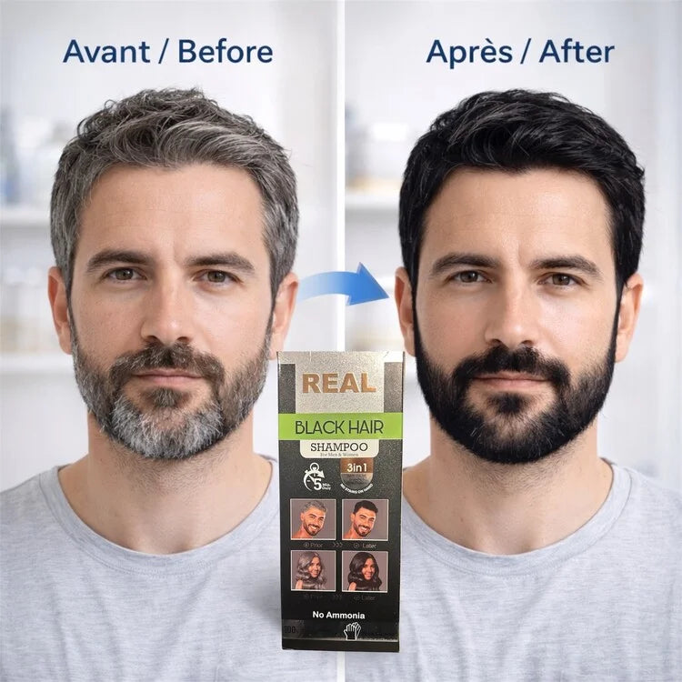 100% Grey Coverage - Covers 100% of white hair : no compromise on coverage. White hair is the most resistant to coloring because it has lost its natural melanin and its structure is slightly different. The BlackHair REAL formula was specifically developed to penetrate and cover the most stubborn white hair with a uniform total coverage, without light spots, without visible residual white hair, without unwanted reflections. The result is a deep, uniform, and natural black across the entire hair, even on a fully white head.